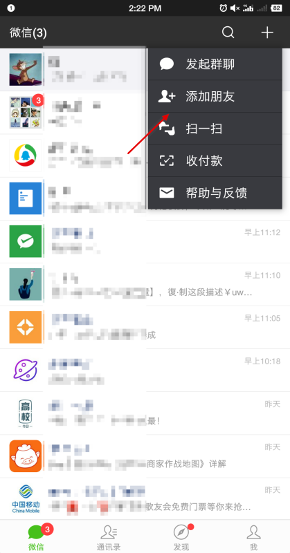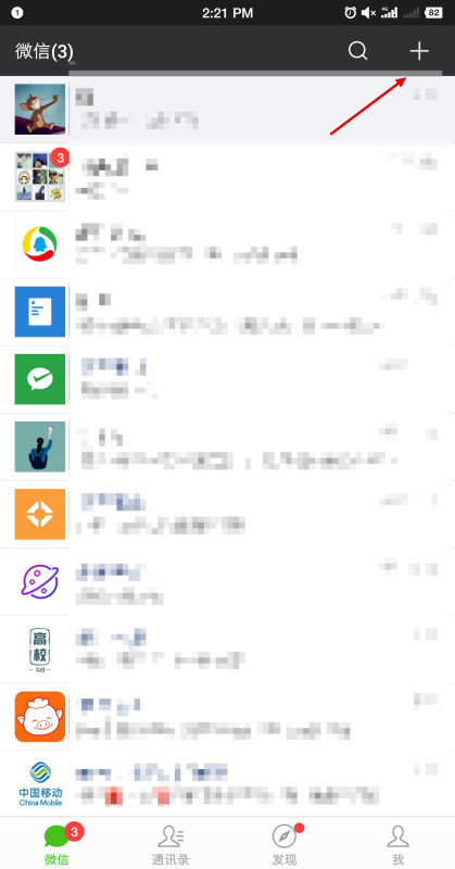 1.打开微信,在微信主页面点击右上方加号按钮,如下图所示。