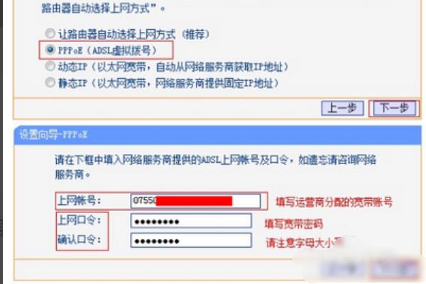 4、选择联网模式一般是pppoe,接着输入宽带帐号、密码,进入到下一步。