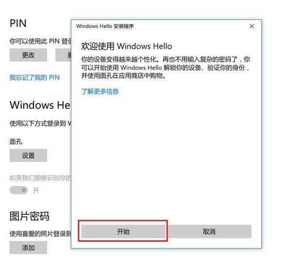 点击【开始】,输入PIN码进行验证,摄像头开始进行人脸扫描,请确保面孔居中。