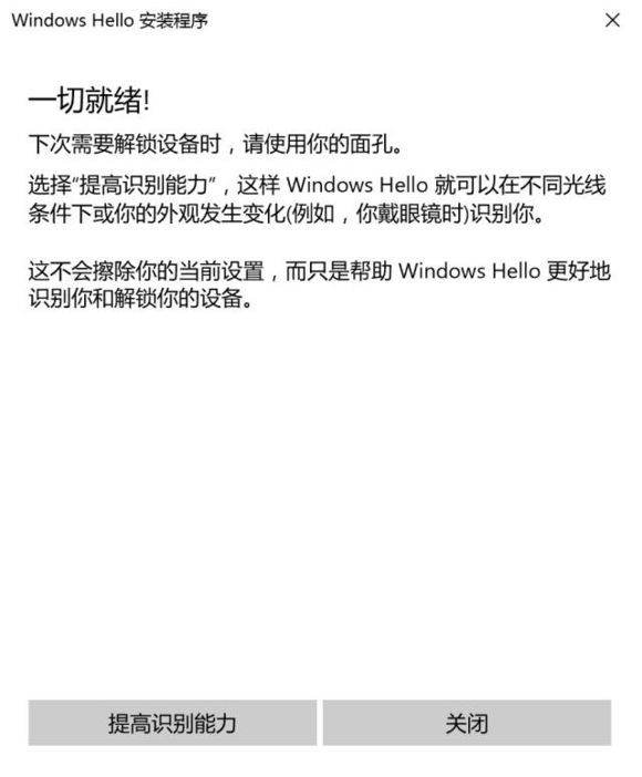 面孔扫描完成后,可以选择【提高识别能力】或【关闭】。