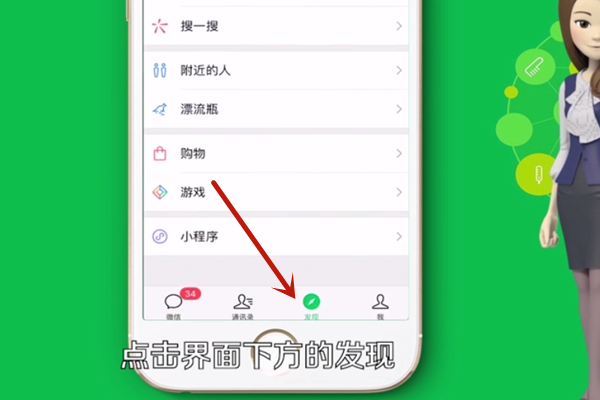 1、在手机上打开微信,点击界面下方的“发现”。