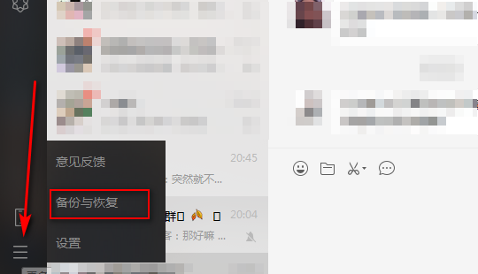 二、登陆后,在windows版微信界面的左下角点击【三】,在弹出的对话框点击【备份与恢复】。