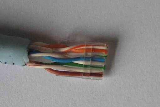 4、导线经修整后(导线端面应平整,避免毛刺影响性能)按照图示要求穿入水晶头内部分线件上,注意穿入的线序