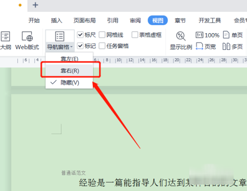 在word的视图选项下,点击导航窗格,选择靠右显示,即可将导航栏显示出来。