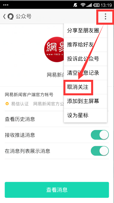 打开网易新闻的公众号界面,点击右上角的三个小方块的按钮,在弹出来的下拉列表里点击”取消关注“即可。