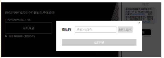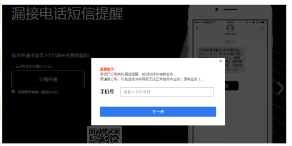 3、再次点击立即开通,提醒用户输入手机号,用户输入手机号后点击下一步后,会收到10655516下发短信验证码;