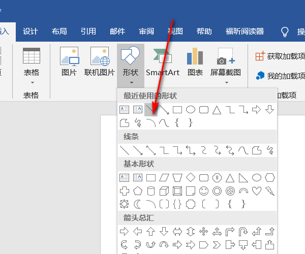 1、打开word文档,点击形状下的横线。