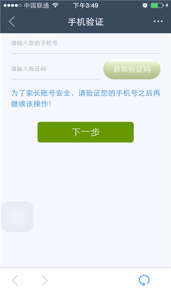 4、输完家长平台号码以后,接着输入家长手机号码,点击下一步;