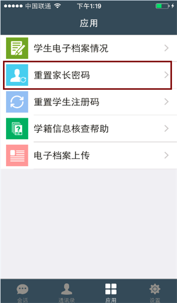 1、使用班主任平台账号登录教育技术服务平台,在“应用”页面选择“重置家长密码”;