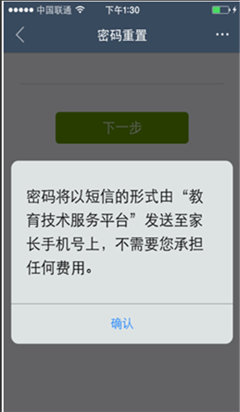 5、这时,会弹出提示密码已经发送至家长手机号的信息,点击”确认“。这样,就可以找回教育服务平台登录密码了。
