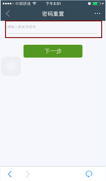 3、班主任手机号码验证后会出现这个”密码重置“页面,这时候要输入家长平台号,点击下一步;
