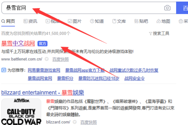 1、在电脑的百度上输入暴雪官网,找到其官方网站以后点击进入。