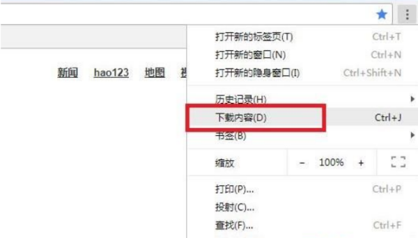 2、打开谷歌浏览器后,点击右上角的三个图标打开菜单,选择“下载内容”。