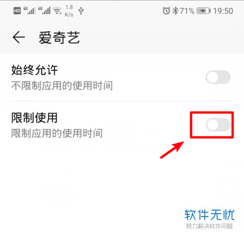7. 第七步,在打开的应用页面中,点击下方限制使用右侧的开关将其打开。