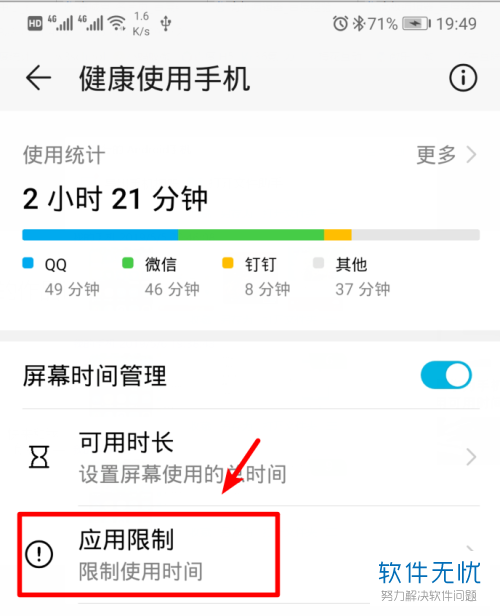 5. 第五步,点击健康使用手机页面下的应用限制选项。