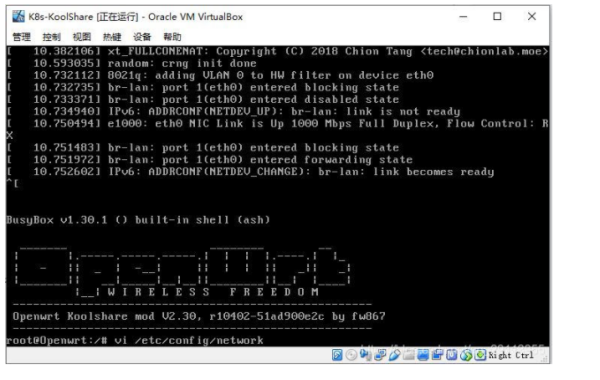 3.软路由启动后,类似下图,点击回车,出现命令行, 编辑 /etc/config/network 文件。