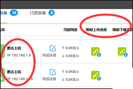 5、点击设备管理之后可以看到当前路由器连接的所有设备,并且在菜单上有一个限制下载速度的地方,没有备注限速就是没有被限速。