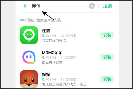 2、在搜索栏中搜索的是连信APP,不能搜索错误。