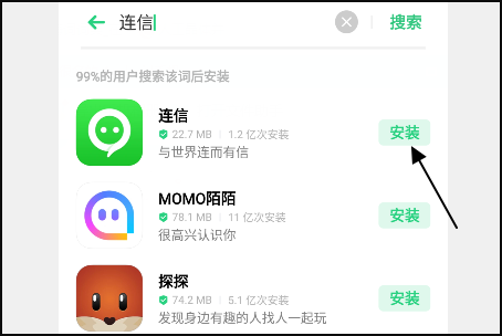 4、点击安装:在搜索栏中搜索连信APP跳转页面后。点击安装。这就是这个步骤了,所以的步骤已经完成了。