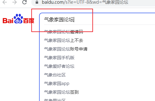 2、在浏览器中输入“气象家园”点击搜索,如下图所示: