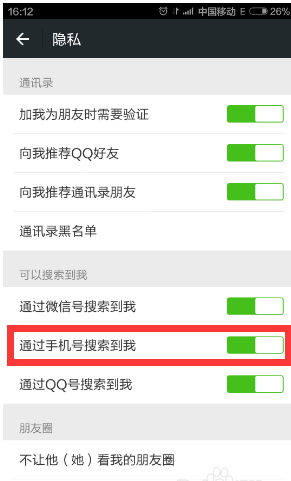 四、进入“隐私”界面后,开启“通过手机号搜索到我”右侧的开关,这样就可以通过手机号添加对方为微信好友。