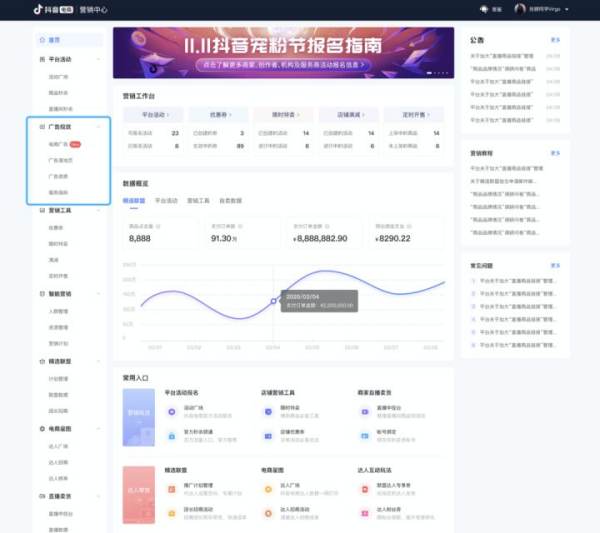 方式二:访问抖店官网,进入抖店商家后台,首页顶部导航栏点击“营销中心”进入营销中心首页左侧导航栏点击“电商广告”,即可跳转巨量千川平台。