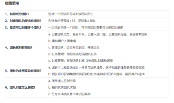 1、如何成为团长?创建一个团队即可成为该团队团长2、创建团队的要求有哪些?创建者问答等级≥13,采纳率≥30%3、是否可以创建多个团队?一次只能创建一个团队,再创建团队需要将当前团队解散4、团长权利有哪些?a. 设置团队信息:是否升级、设置入团门槛、设置团队标签、是否解散团队b. 审核用户入团申请c. 管理团队:团员升级副团、开除团员d. 任务管理:领取或者取消团队任务e. 财富管理:支配团队财富-发放团队财富给团员5、团长的金币奖励有哪些?a. 团长可以和普通团员一样参与团队任务,获得相应的任务额外奖励奖励b. 团长可以获得整团成员获得的任务奖励金币的5%提成,副团得2%提成6、团队财富怎么获取?a. 团员通过签到宝箱b. 每月优秀团队奖励c. 每月完成团队基本考核的奖励