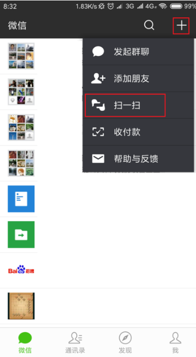 1、打开微信应用,点击主页面右上角“+”按钮,选择“扫一扫”菜单。