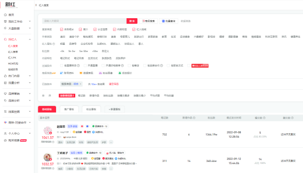 新红「红人搜索」可设置作者类别、粉丝画像、数据表现、投放报价等条件来找到目标账号。