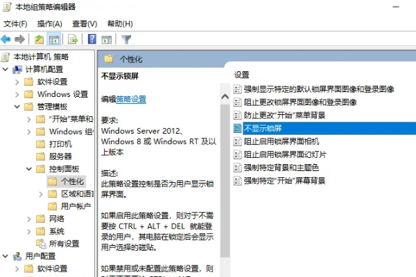 2、打开Win10组策略操作面板,在左侧依次展开计算机配置,管理模板,控制面板,个性化,然后在右侧双击“不显示锁屏”。