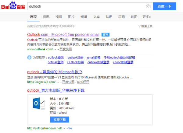 1、打开浏览器进入百度搜索,在边度搜索中搜索outlook并在出现的结果中点击outlook网站;