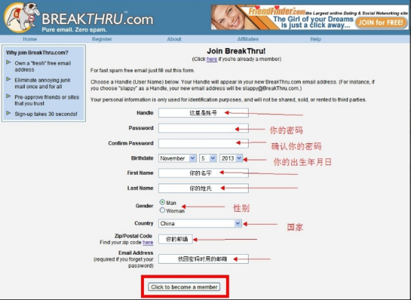 3、然后一一填写各种邮箱注册信息,各种信息的翻译如下图所示