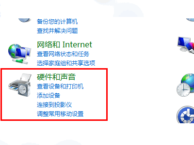 2、其次,在控制面板菜单中选择“硬件和声音”,如下图所示,然后进入下一步。