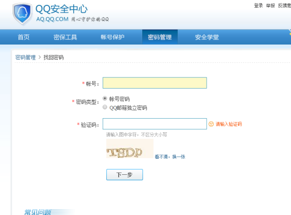 2.进入QQ安全中心,按要求输入需要找回密码的QQ账号和验证码,点击【下一步】。