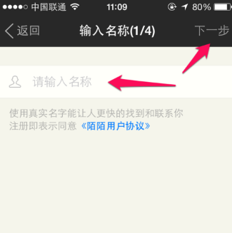 在手机打开陌陌,点击注册,输入自己的昵称。