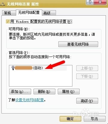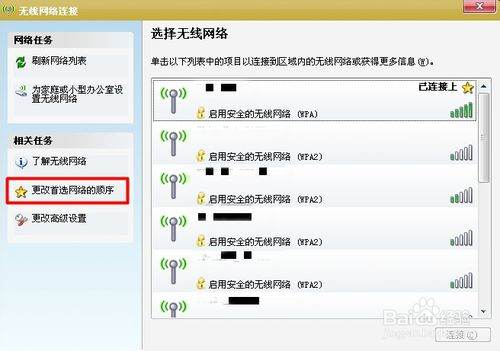 查看箭头所指示的这块区域。如果有多个无线网络的话,则删除您不常用的那些,留下1个或2个您常用的无线网络,并确定您正在使用的那个无线网位于第一位。
