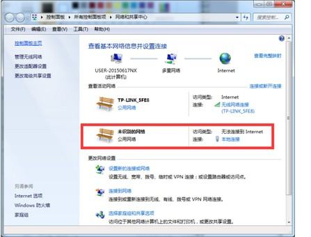 如果本地连接采用指定ip地址,网络和共享中心即会显示未识别的网络,如下图: