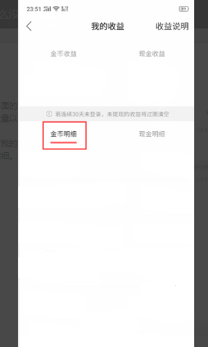 4、这时,我们可以在该界面的左上角看到我们的金币获取数量以及现金收益。点击“金币收益”,可进入“我的收益”界面,看到金币获取明细。
