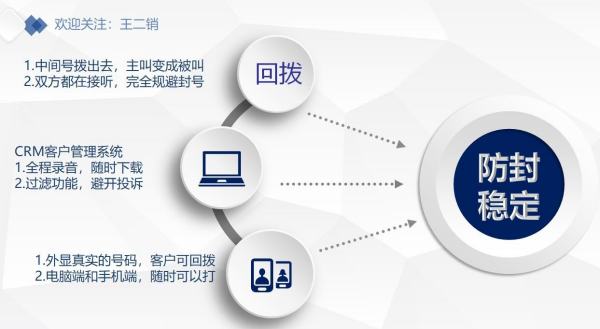 回拨模式如何解决封号的问题呢?其实是改变了拨号的方式,当你打电话给客户的时候,实际上是打给了系统的号,系统的号再打给你和客户,这样一来,你跟客户都处于接电话的状态。你没有任何的呼出记录,当然就不存在高频呼出的问题了,这就是回拨模式的原理。