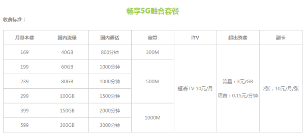 599档享1000M宽带,包含300G国内流量和3000分钟国内通话;