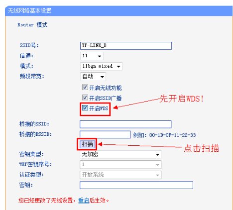 注意:如果不是TP-Link的无线路由器,在两台无线路由器启动WDS后,在WDS的设定中,是需要互填对方路由器的MAC地址的。还有一些无线路由器在开启WDS后,只支持使用WEP的加密方式,用户也需要注意。