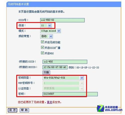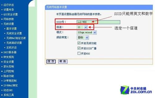 在IE浏览器中,输入A路由器的Web界面IP,这里是192.168.1.1,进行登陆。在“无线设置——基本设置”中设置“SSID号”和选择一个固定的“信道”。这里我们设定“SSID号”为“zol-WDS”,“信道”为“11”,如下图红框中所示。