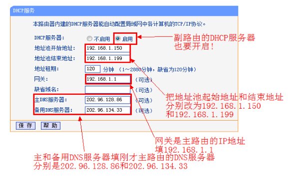 9、点击【DHCP服务器】---【DHCP服务器设置】,把【地址池起始地址】改为192.168.1.150,把【地址池起始地址】改为192.168.1.199。【网关】填写主路由器的IP地址,即192.168.1.1。主和备选DNS服务器填之前记录下来的地址保存并重启路由器。