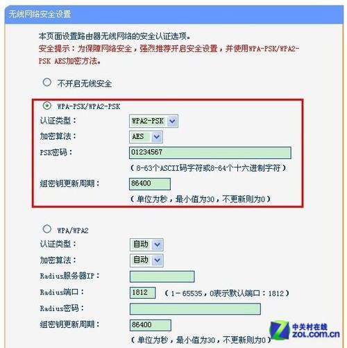 在“无线设置——无线安全设置”中,设置无线加密的算法和密码信息,点击“保存”。这时中心无线路由器A就设置好了。