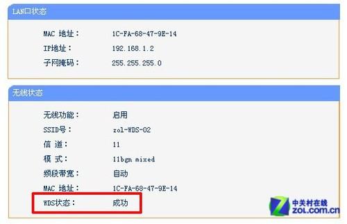 无线路由器B与无线路由器A建立WDS连接成功(见红框内)