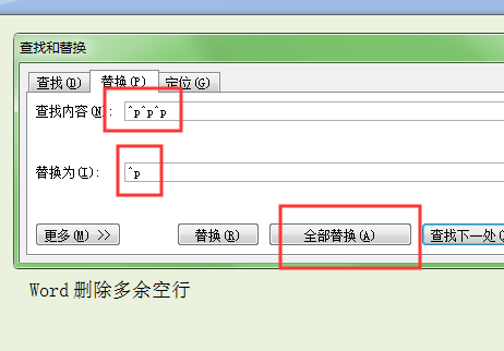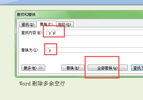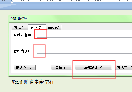 三、 手动换行符全部替换为段落标记后,在查找内容内输入两个段落标记,替换为内输入一个,全部替换,意思是把两段文字中间空一行(两段文字间空一行说明第一段文字后面是有两个段落标记)的全部替换为无空行。