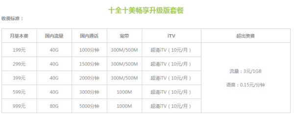 399档享1000M宽带,包含150G国内流量和2000分钟国内通话;