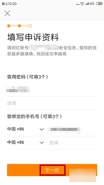 9、第二步是填写我们曾经用过的密码和手机号,可以填写三个,填的越多越容易找回密码,填好后点击【下一步】。
