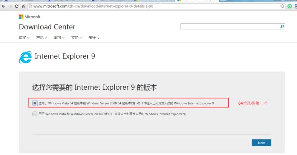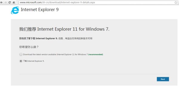 在页面上选择“下载 Internet Explorer 9.” 因为现在微软主推IE11,根据你的需要选择吧