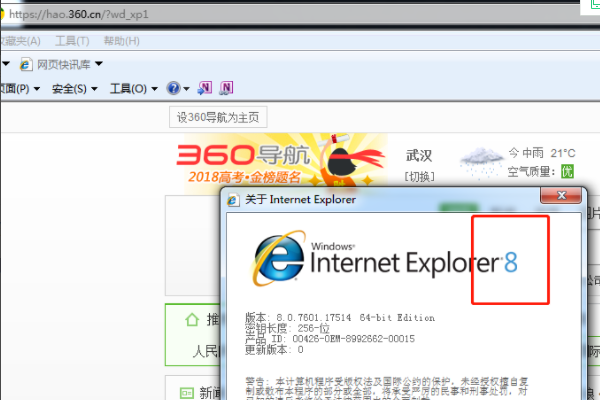 4、在弹出的窗口中,可以看到自己已经安装的IE浏览器版本,这里可以看到是IE8。